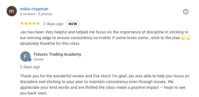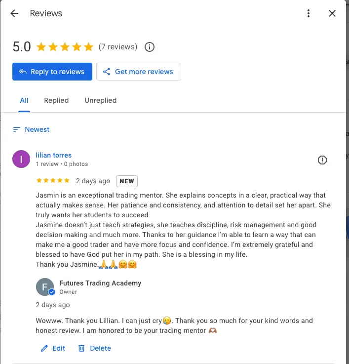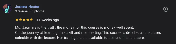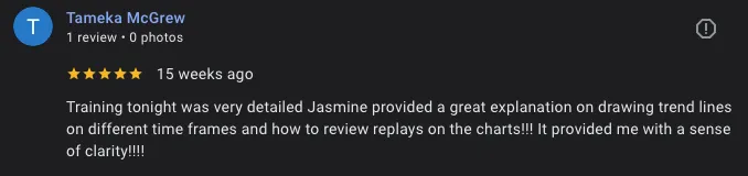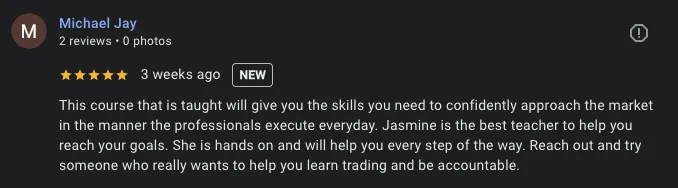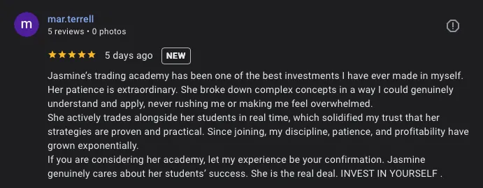 Jasmine's Student's consistantly rate her 10/10 calling her the best trading teacher they've ever had.